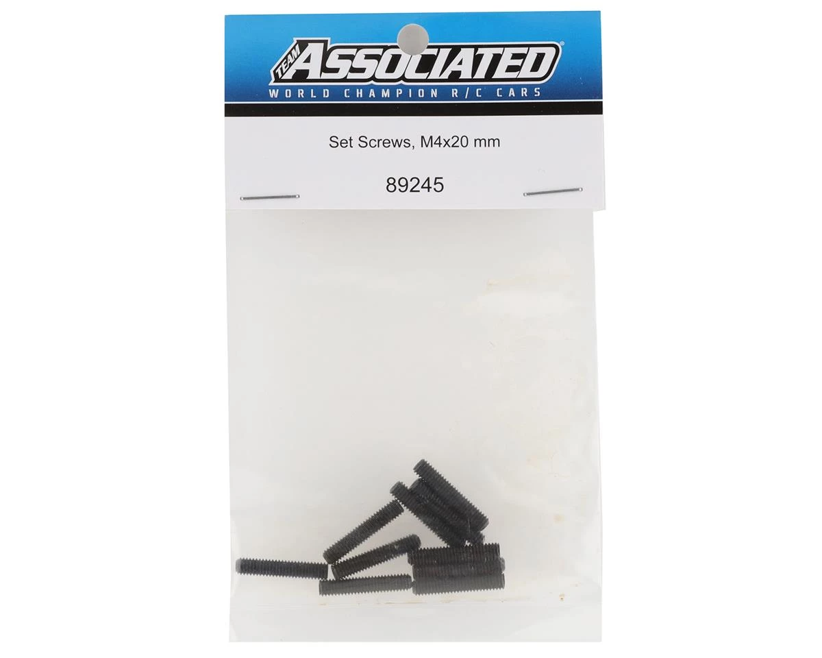 Team Associated 4x20mm Set Screws. These replacement screws are intended for the Team Associated Rival MT8. Package includes ten set screws.