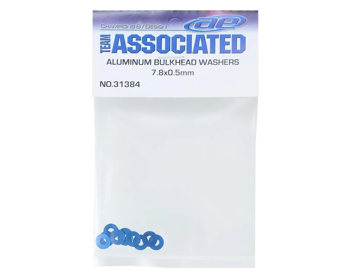 This is a ten pack of Team Associated 0.5mm Thick Aluminum Bulkhead Washers. These washers are made from aluminum alloy material and anodized blue.