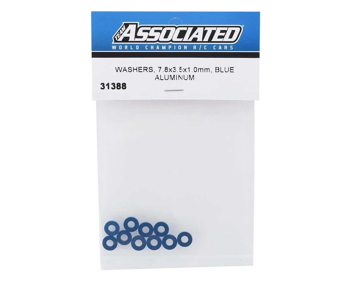 This is an optional Team Associated Blue 7.8×3.5×1.0mm Aluminum Hub Spacer Washer Set, intended for use with the RC8B3 and RC8T3 series vehicles for adjusting the wheelbase. Thicknesses range from .5mm, 1mm, and 2mm. Use these on any vehicle with 3.5mm hinge pins to tune the wheelbase.