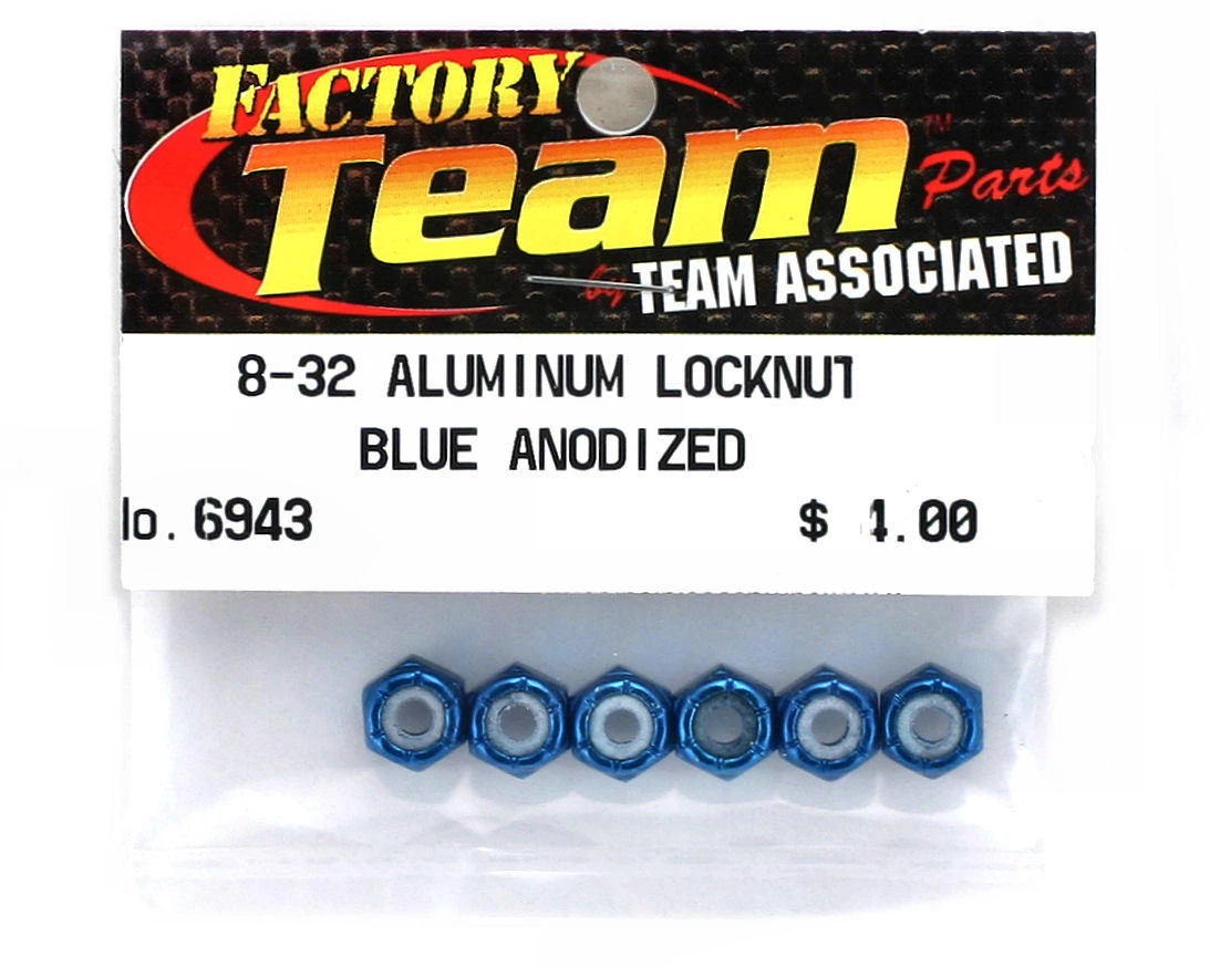 This is a pack of six replacement 8-32 blue anodized aluminum lock nuts from Team Associated.