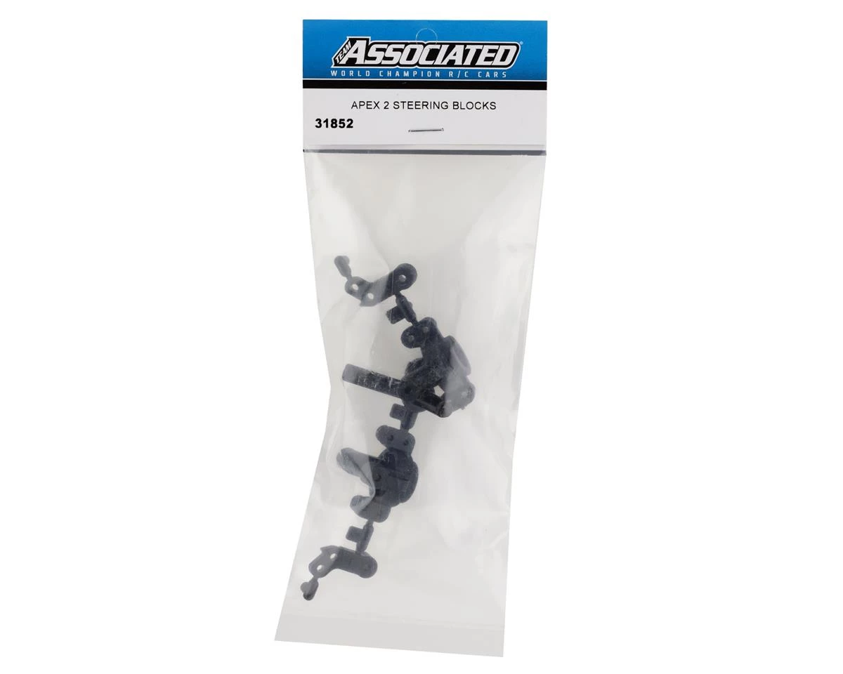 Team Associated Apex2 Steering Block. This replacement steering block set is intended for the Team Associated Apex2. Package includes two steering blocks and two steering arm inserts.