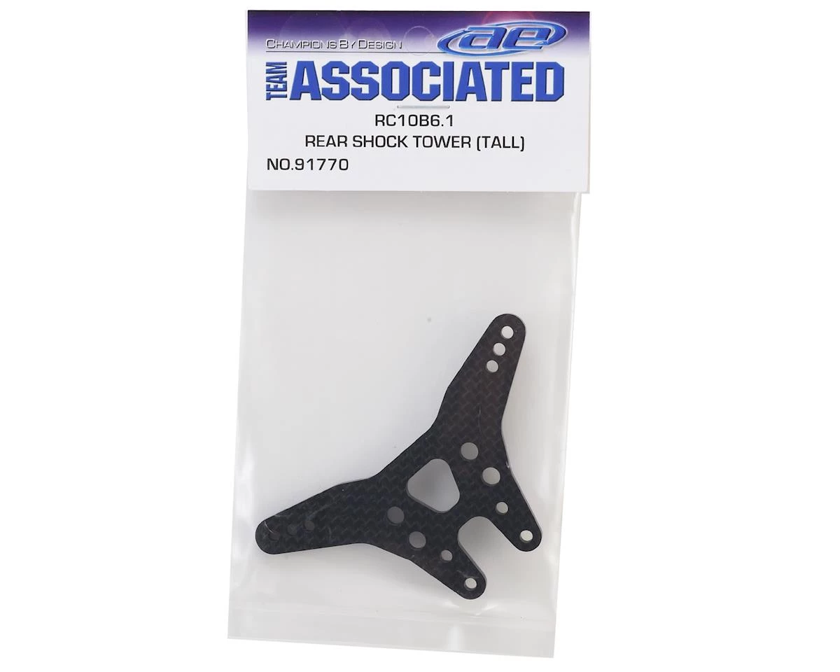 Team Associated B6.1/B6.1D “Long” Carbon Fiber Rear Shock Tower. This is the long type tower. Package includes one “long” rear shock tower.