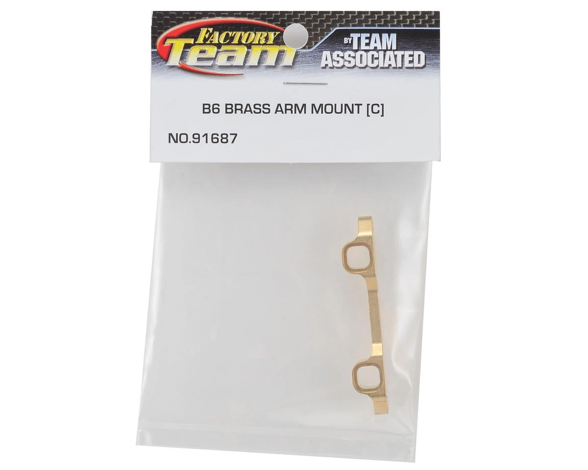 Team Associated B6 Factory Team Brass “C” Arm Mount. This is the optional brass “c” arm mount for the RC10 B6 and B6D buggies. This mount will allow you to add 12 grams of weight in front of the rear axle for improved traction and overall stability.