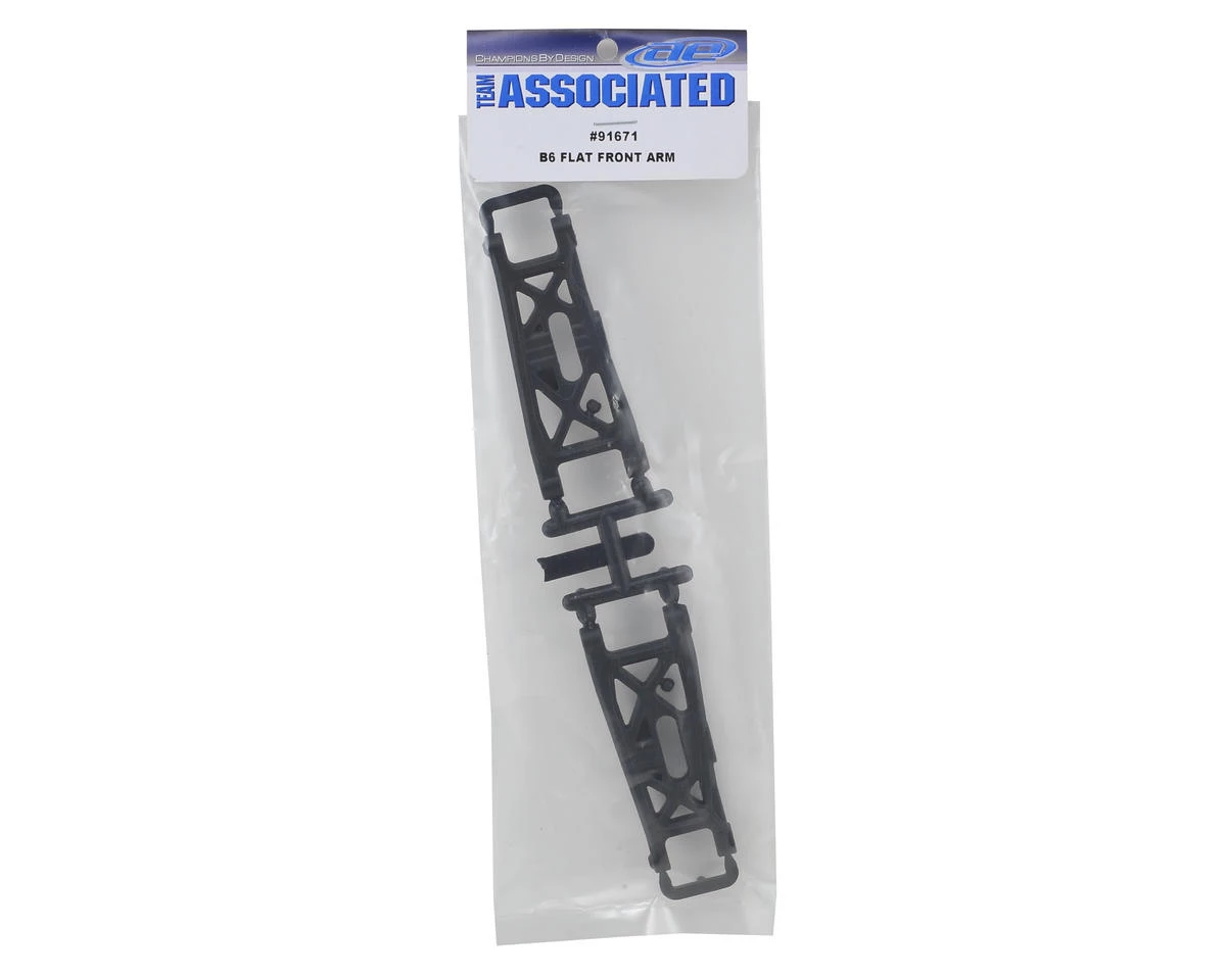 Team Associated B6 “Flat” Front Arms. These are the replacement flat arms for the RC10 B6, but when combined with the flat front shock tower (ASC91661) are compatible with the B6D as well.