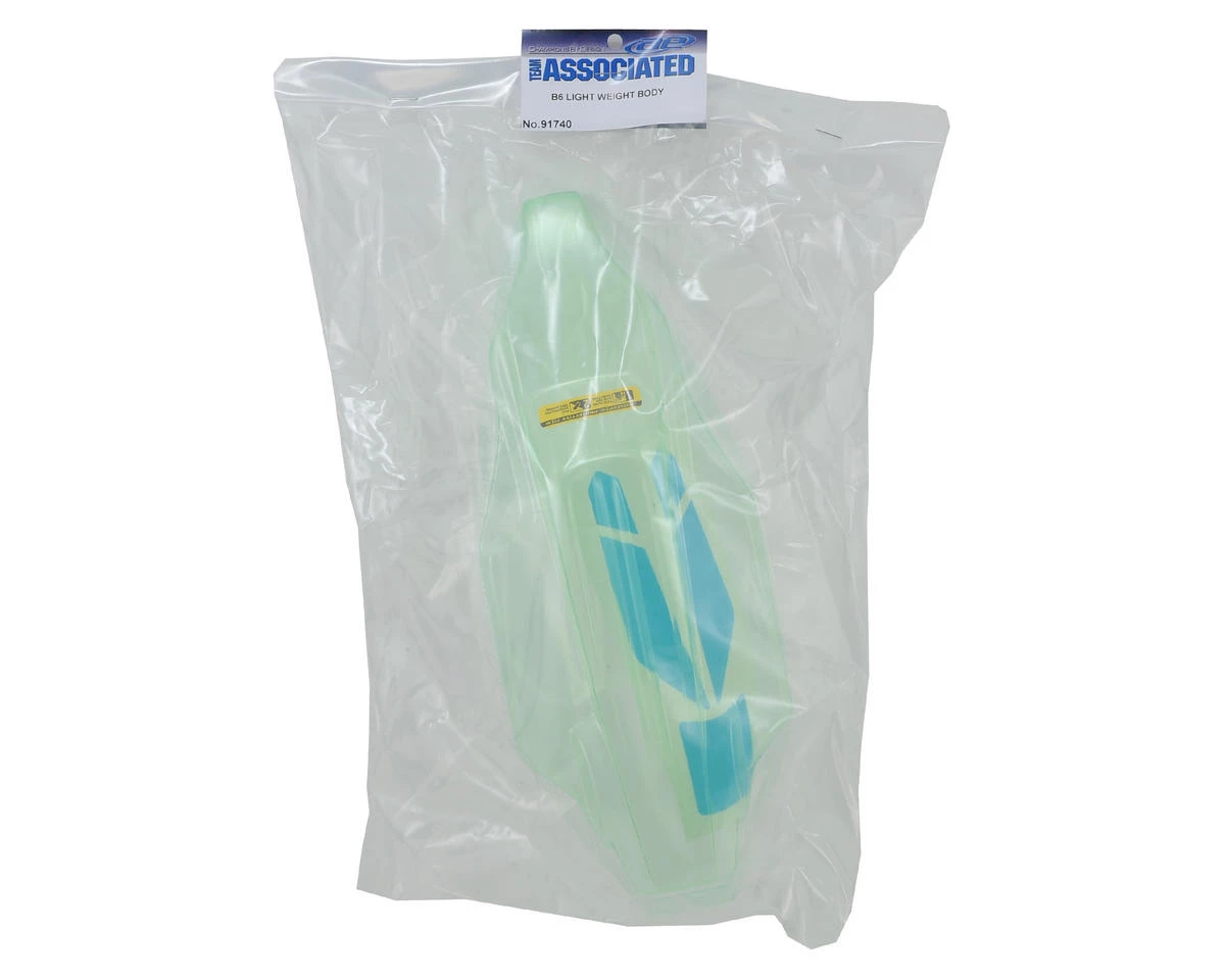 Team Associated B6 Lightweight Body. This is the optional lightweight body for the RC10 B6 and B6D 1/10 buggies. Package includes clear body with factory applied overspray film.