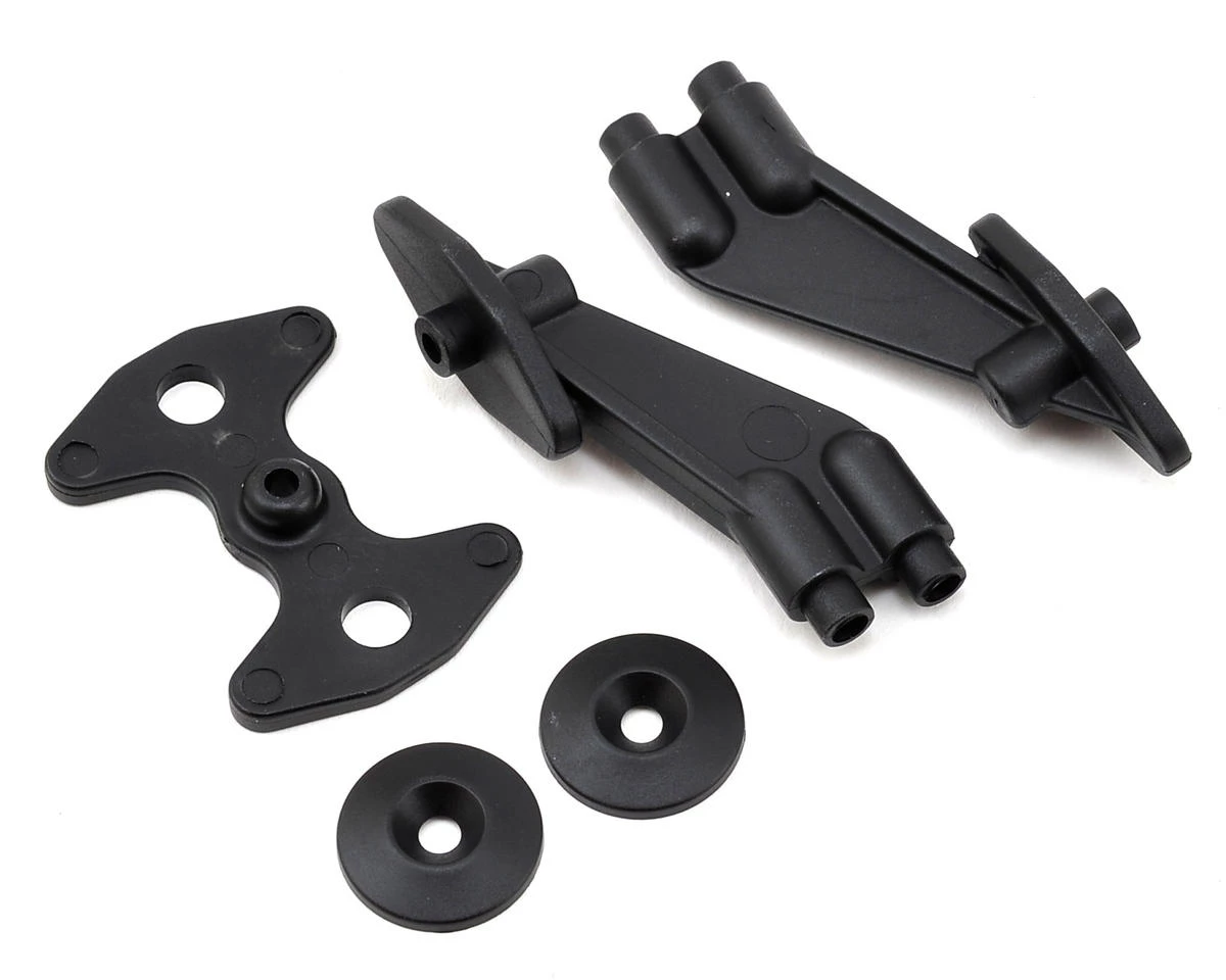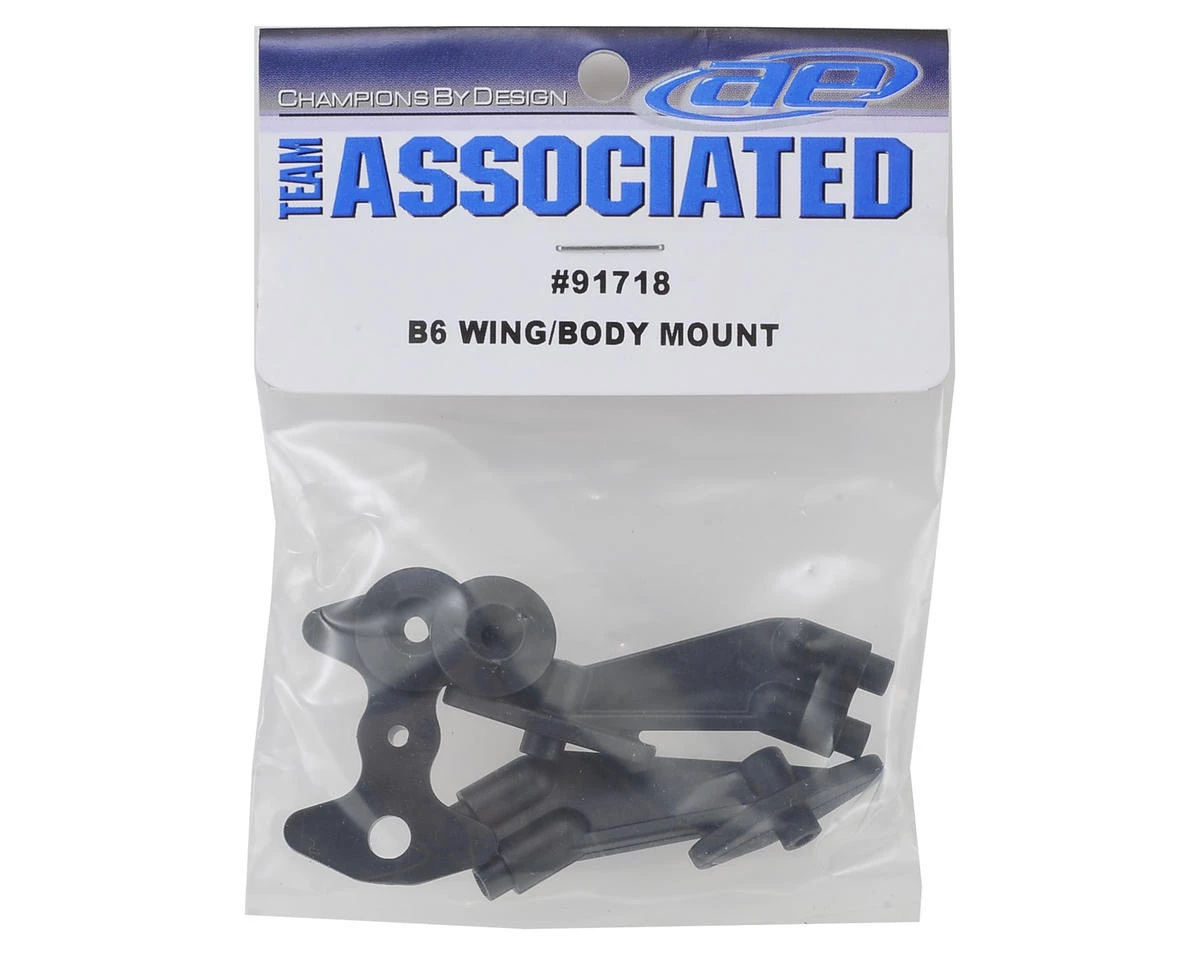 Team Associated B6 Wing/Body Mount. This is the replacement wing mount for the RC10 B6 and B6D buggies. Made from molded composite, this features holes allowing for the optional Team Associated Factory Team Aluminum Wing Mount (ASC91903). Package includes left and right wing braces, shim plate and wing mount buttons.