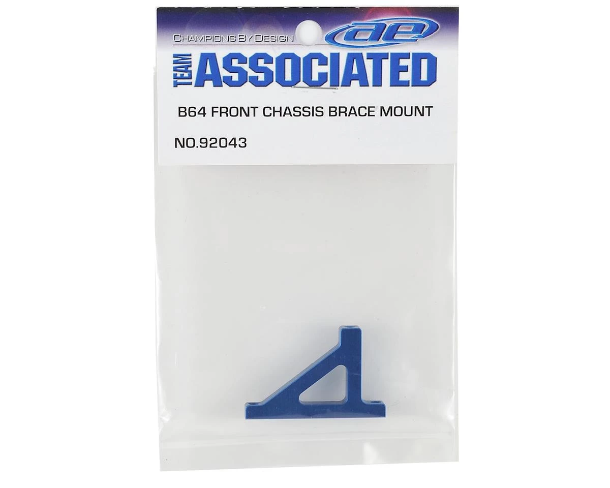 Team Associated B64 Aluminum Front Chassis Brace Mount. This is the standard replacement front chassis brace mount for the B64D buggy. Package includes one mount.