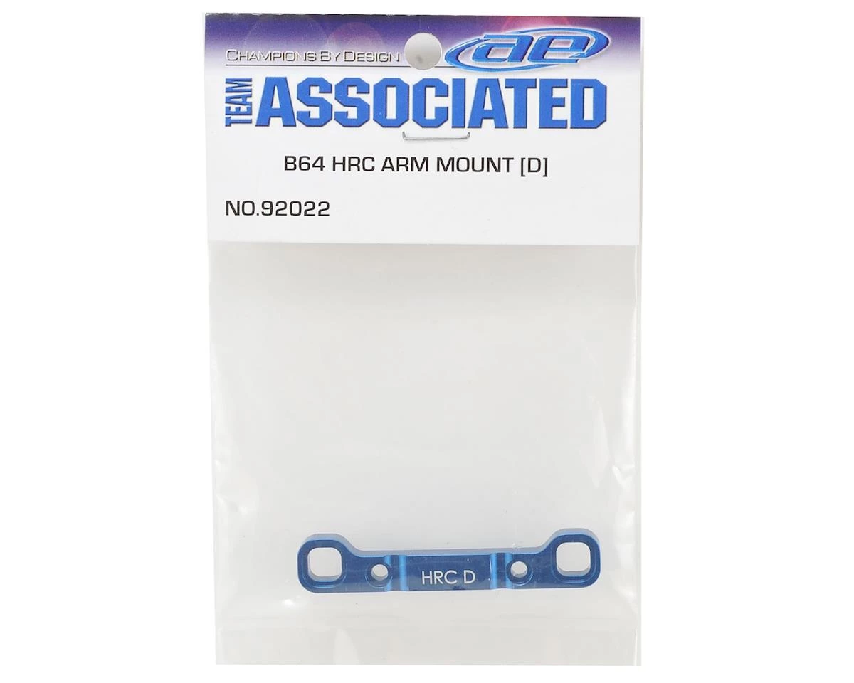 The Team Associated B64 Aluminum HRC “D” Arm Mount will raise the roll center of the rear hinge pins. You must use this arm mount and the ASC92020 C arm mount together to raise the hinge pins relative to the diff height for High Roll Center (HRC).