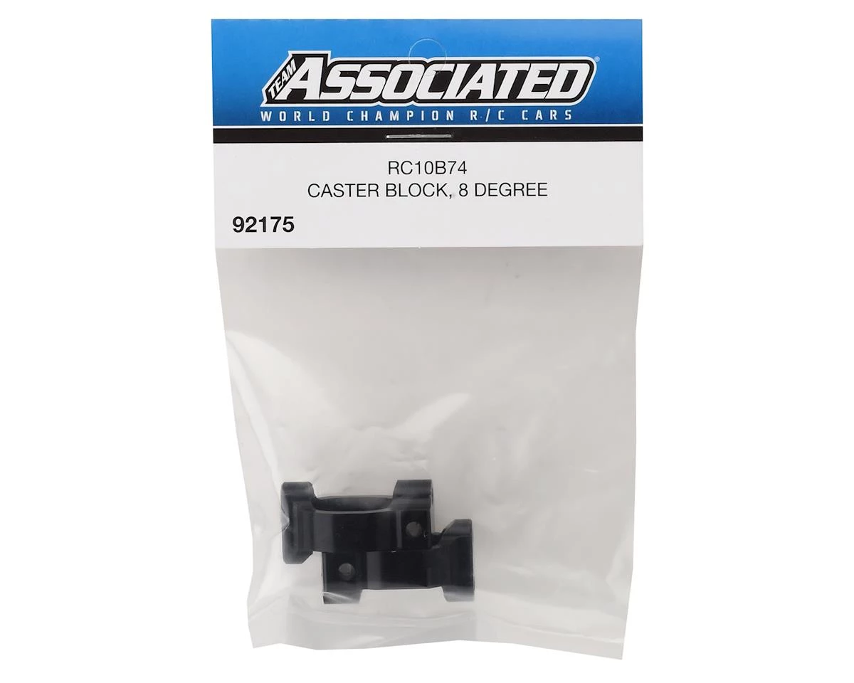 This is a pack of two optional Team Associated B74 8° Aluminum Caster Blocks. These blocks provide slightly less Caster than the stock 9° blocks (ASC92176).