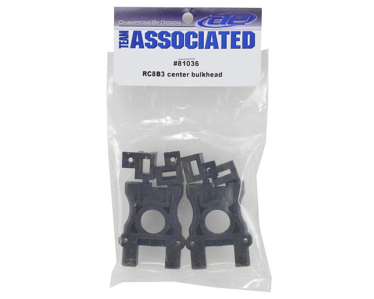 This is a replacement Team Associated Center Bulkhead, intended for use with the RC8B3. This package includes the front and backside bulkhead halves, as well as the disc brake braces.