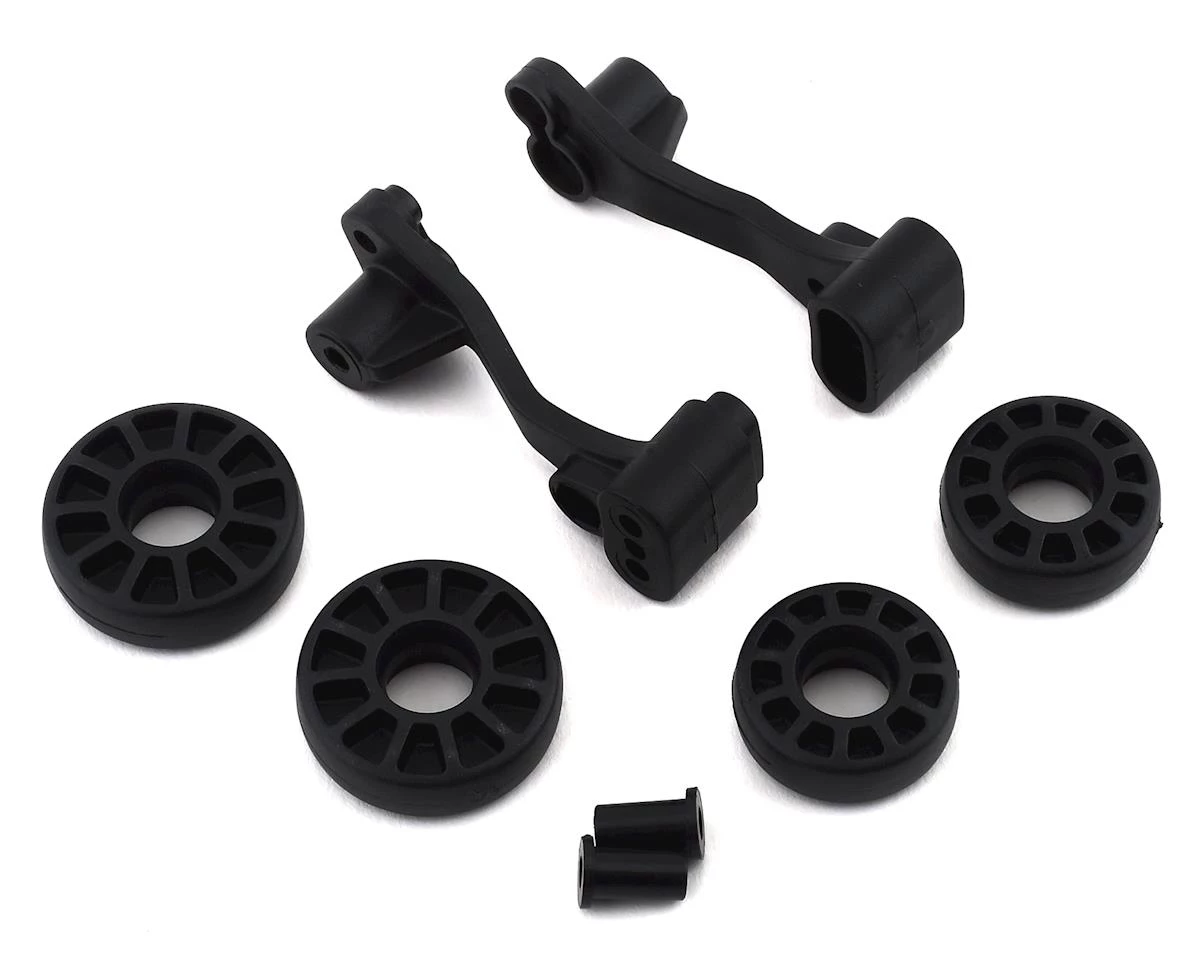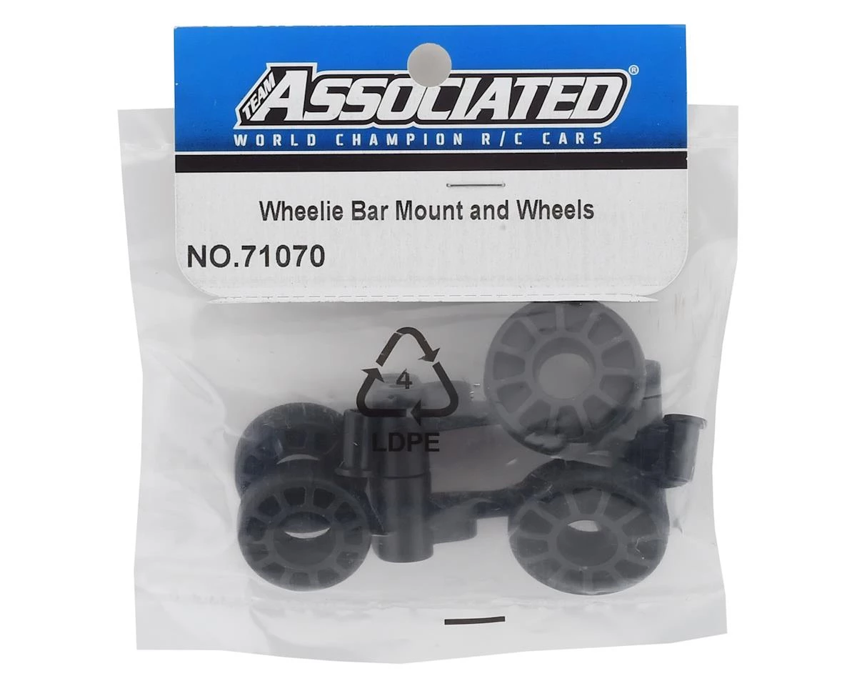 Team Associated DR10 Wheelie Bar Wheels & Mount. Package includes replacement wheelie bar mount, bushings and two sets of wheels (two large, two small).