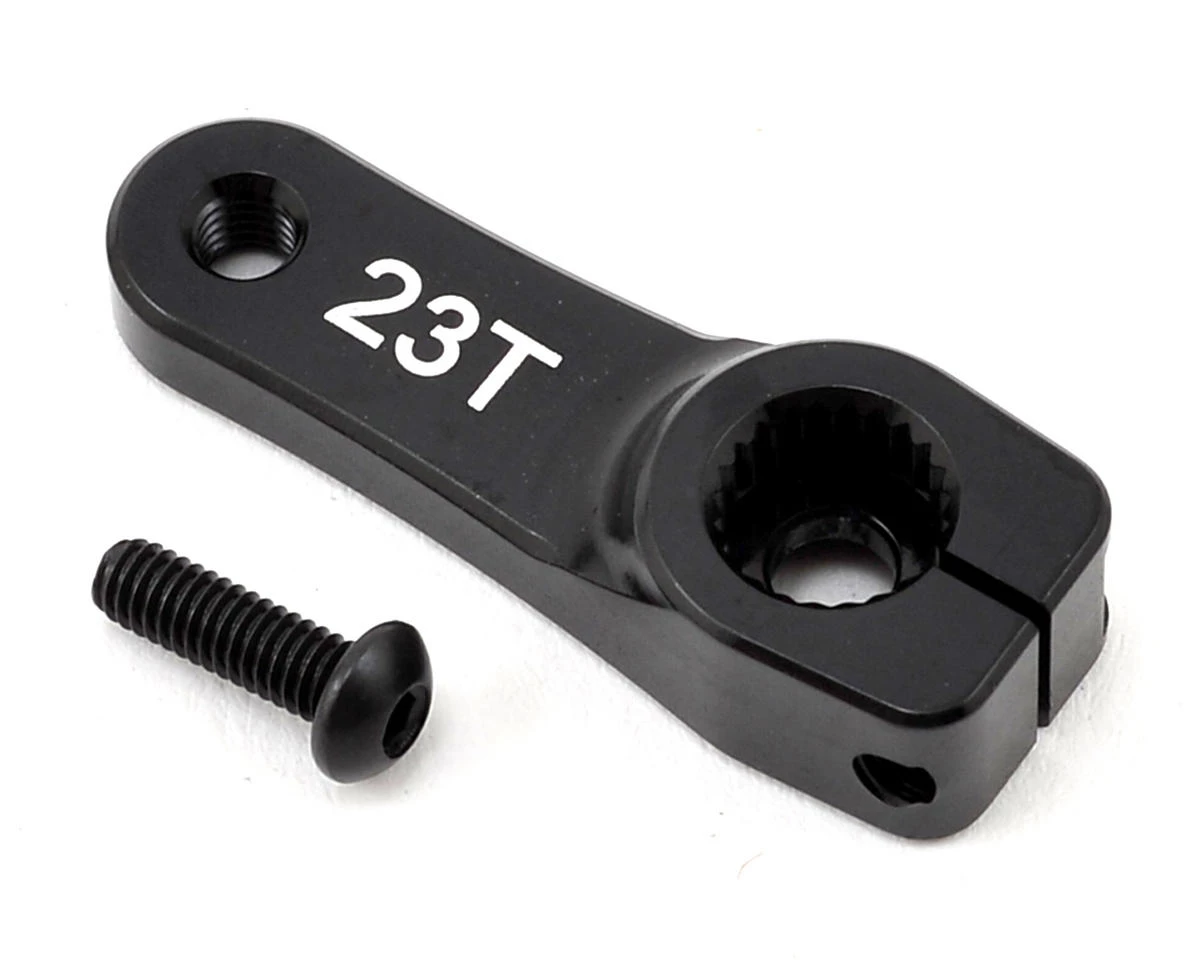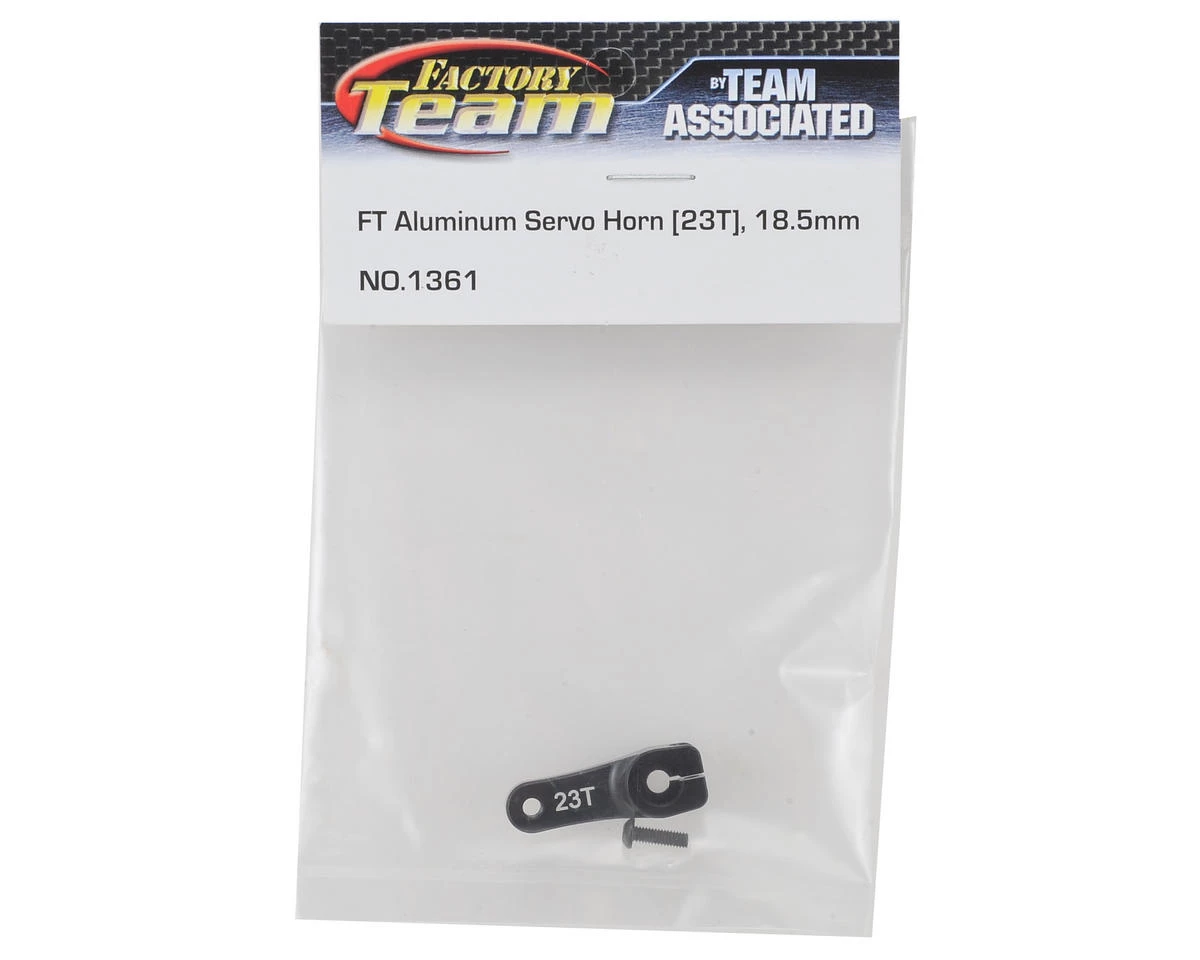 The Team Associated Factory Team Aluminum Servo Horn was developed for the steering servo in the RC8B3, RC8B3e, RC8T3, and RC8T3e models. These machined aluminum servo horns are stronger than the stock plastic horns that come with most servos and due to the slightly shorter length, they provide a smoother steering feel and decrease the load on the servo. 23T fits Airtronics, JR, KO, and Spektrum servos.