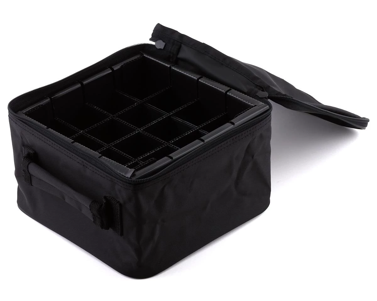 The Team Associated Factory Team Fluid Carrier Bag measures 8x8x5.25″ (203x203x134mm), and is a great option to carry up to sixteen of your favorite fluids in neat compartments. The zipper enclosure keeps contents secure, the top flap’s inner pocket adds extra storage, and the fabric handle makes carrying comfortable. Inner dividers can be removed to store alternate items, if desired. The prestigious Factory Team logo on the top positions this carrier bag in a league of its own.