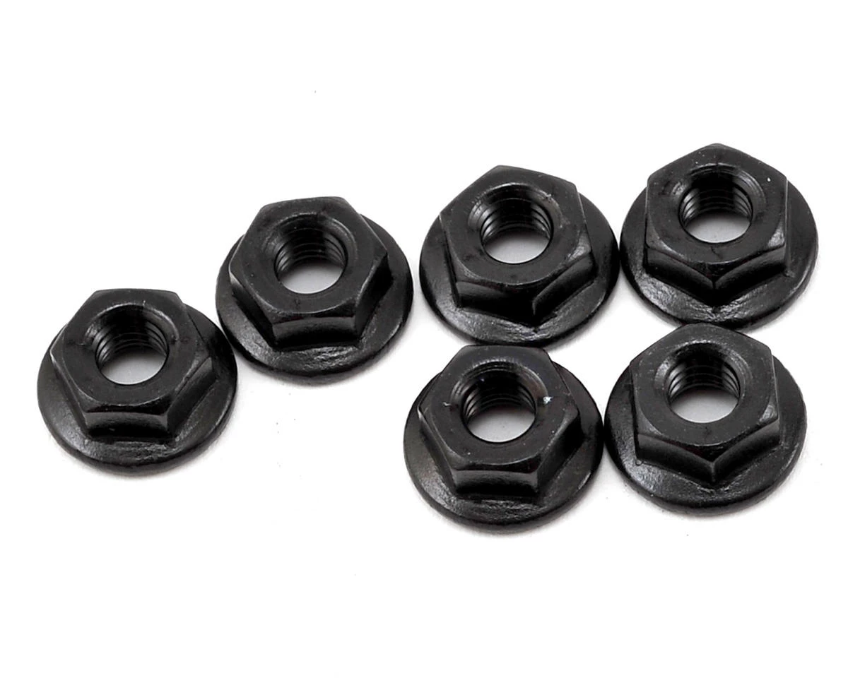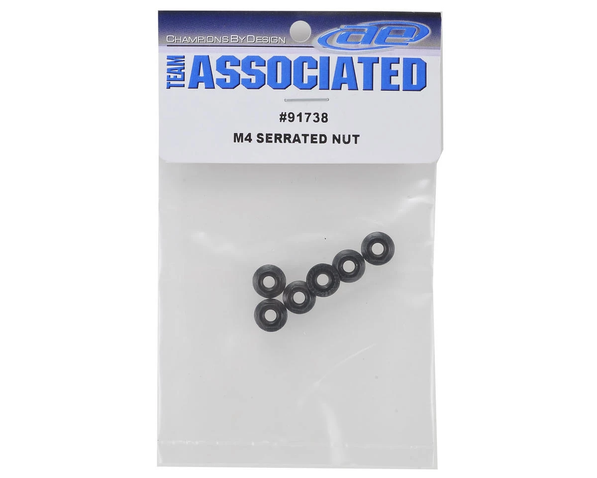 Team Associated M4 Serrated Nuts. These are the replacement M4 nuts used on the front and rear of the RC10 B6 and B6D buggies. Package includes six M4 serrated nuts.