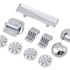 This is an optional Team Associated Chrome NanoSport Race Pack, intended for use with the NanoSport race car kit. This kit includes an optional driver head, two exhaust pipes, engine, four hub caps and a spoiler. Hardware and a decal sheet are also included.