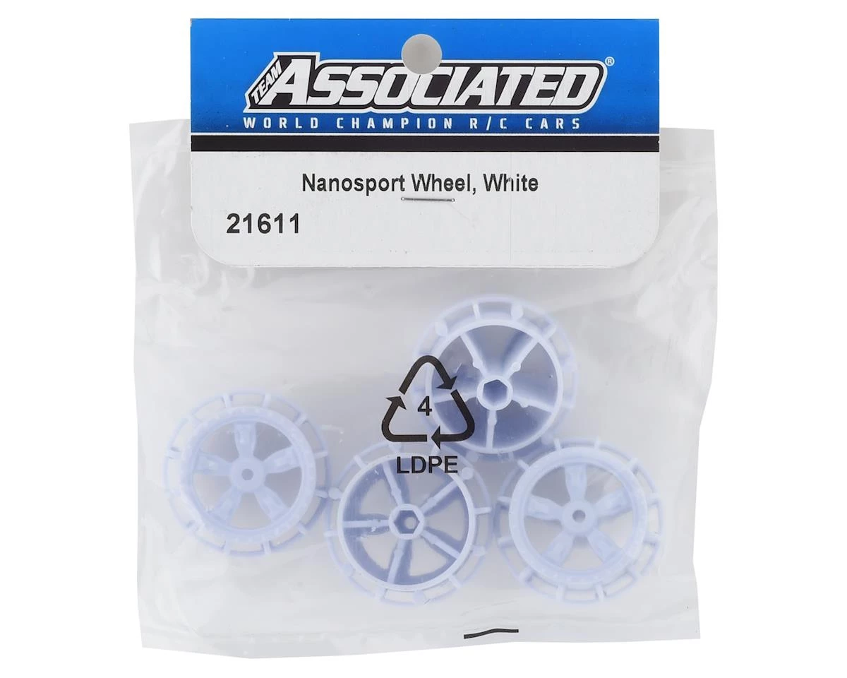 This is a replacement pack of four Team Associated White NanoSport Wheels, intended for use with the NanoSport 1/32 2WD RTR Cars.