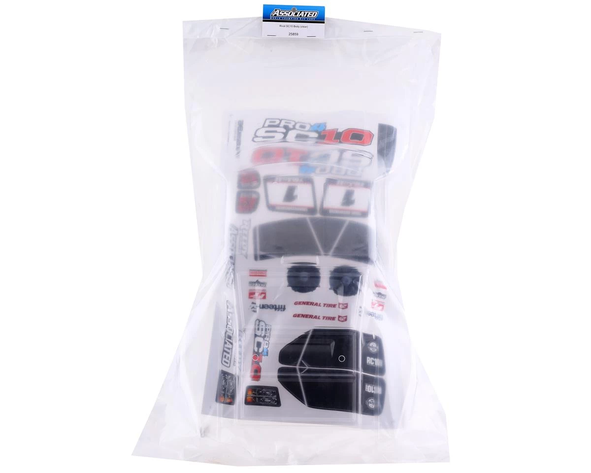Team Associated Pro4 SC10 Contender Body. This optional body set allows you to add your own paint scheme to your Team Associated Pro4 SC10. Package includes one clear body, one decal sheet and four body clips.