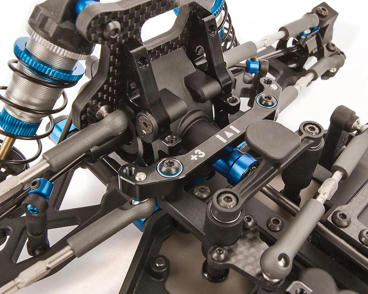 - Redesigned 4mm carbon fiber front shock tower has been lowered by 2mm and features an additional row of camber link positions