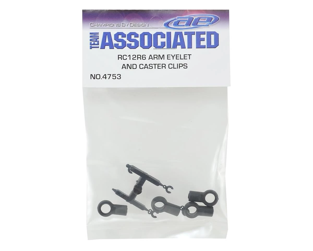 Team Associated RC12R6 Arm Eyelets & Caster Clips. These are the replacement upper arm eyelets. Package includes four arm eyelets, two washers, two 1-dot clips and two 2-dot clips.