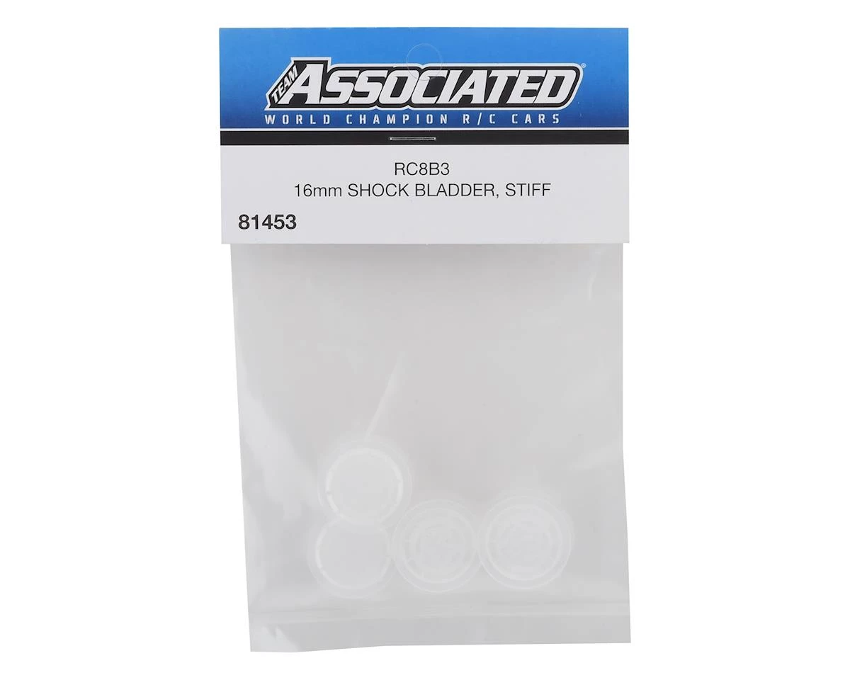 Team Associated RC8 B3.2 16mm “Stiff” Shock Bladders. Package includes four replacement shock bladders compatible with the Team Associated RC8 B3.2 and B3.2e. These can also be used as a tuning option for the full range of RC8 B3 and RC8 T3 models, when more pack is needed on tracks with big jumps or high impact landings.