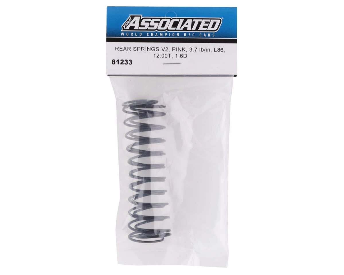 This is a pack of two Team Associated RC8B3.1 Rear Shock Springs. These springs are rated 3.7lb/in and color marked Pink. These springs are 86mm long with a 12 Turn and 1.6 wire diameter.