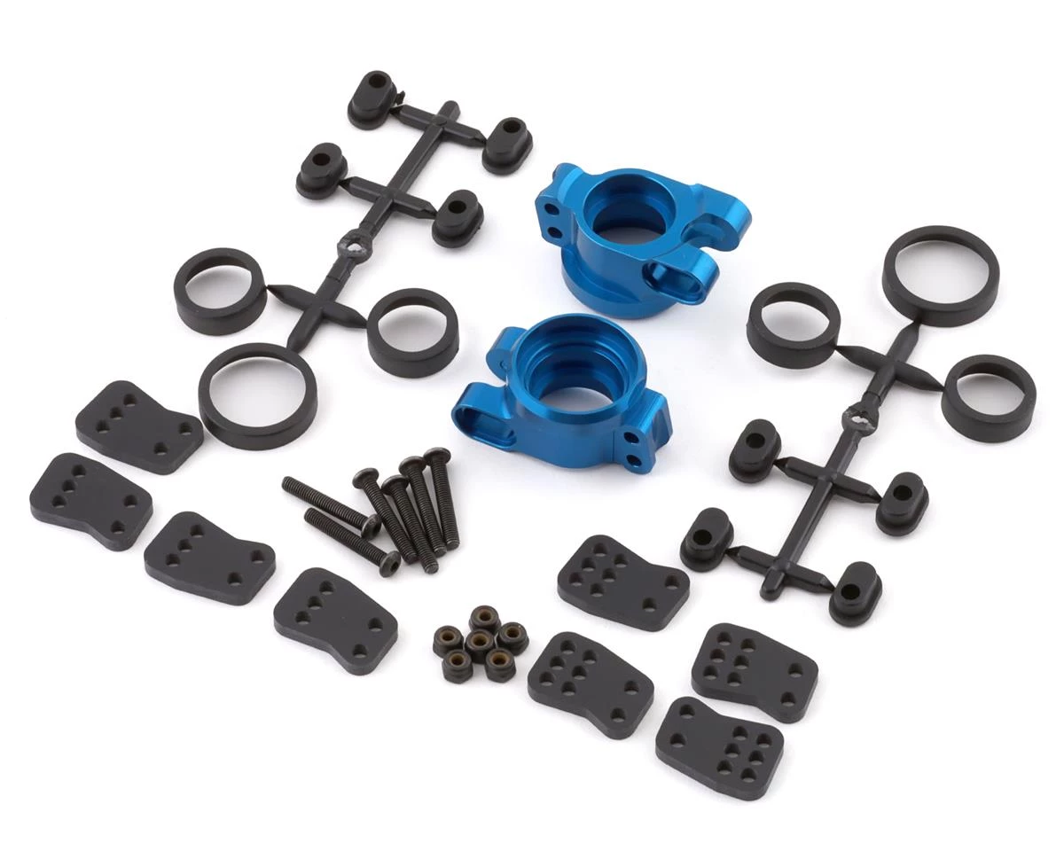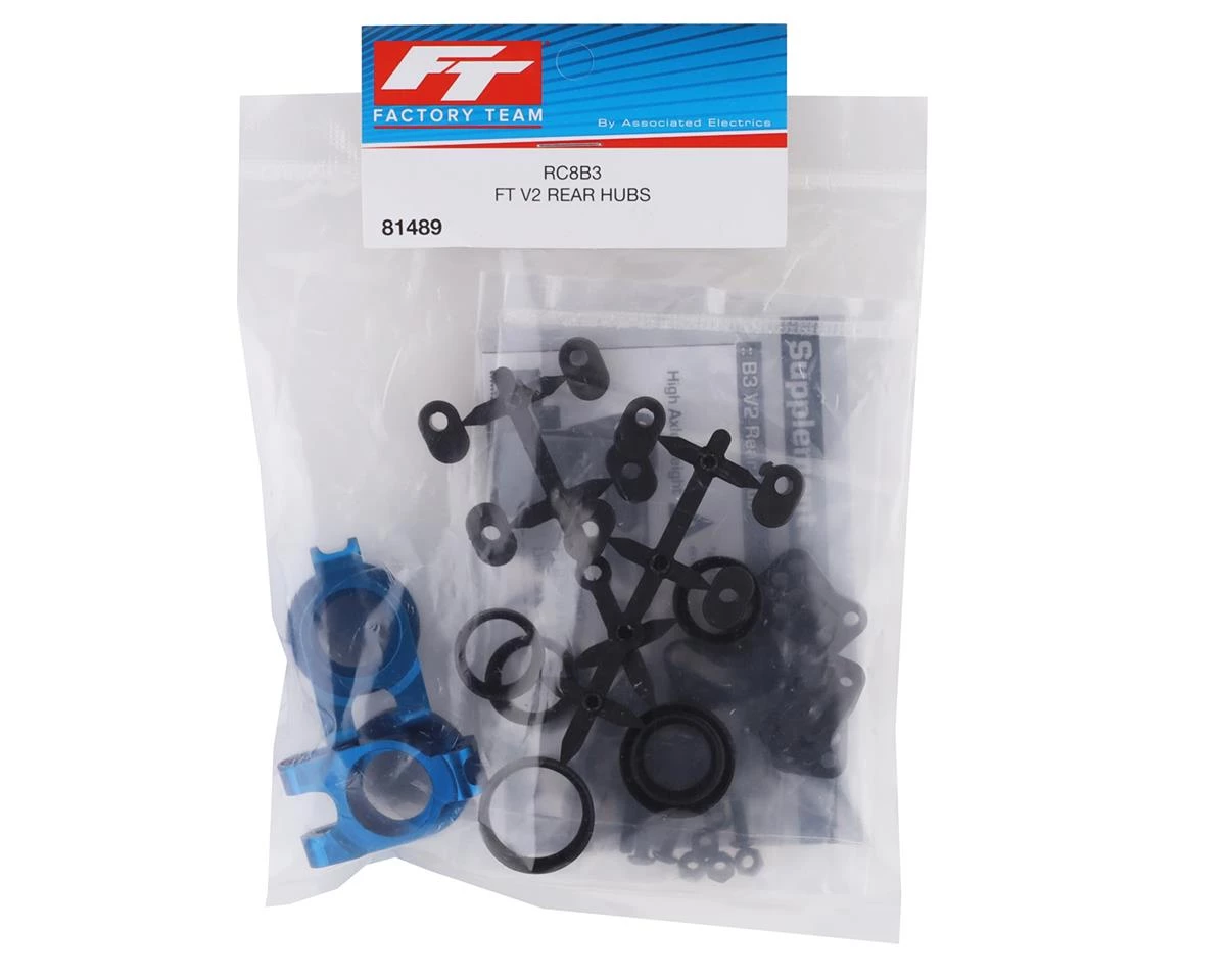 The Team Associated RC8B3 Factory Team V2 Rear Hub Set is a great way to provide more tuning options to your RC8B3 series buggy. Using CNC machined aluminum hubs, these feature molded inserts to adjust the axle height allowing for a low, medium and high setting. Two link kits are included (ASC81490 and ASC81491) to allow for very fine adjustments of the roll center.Â