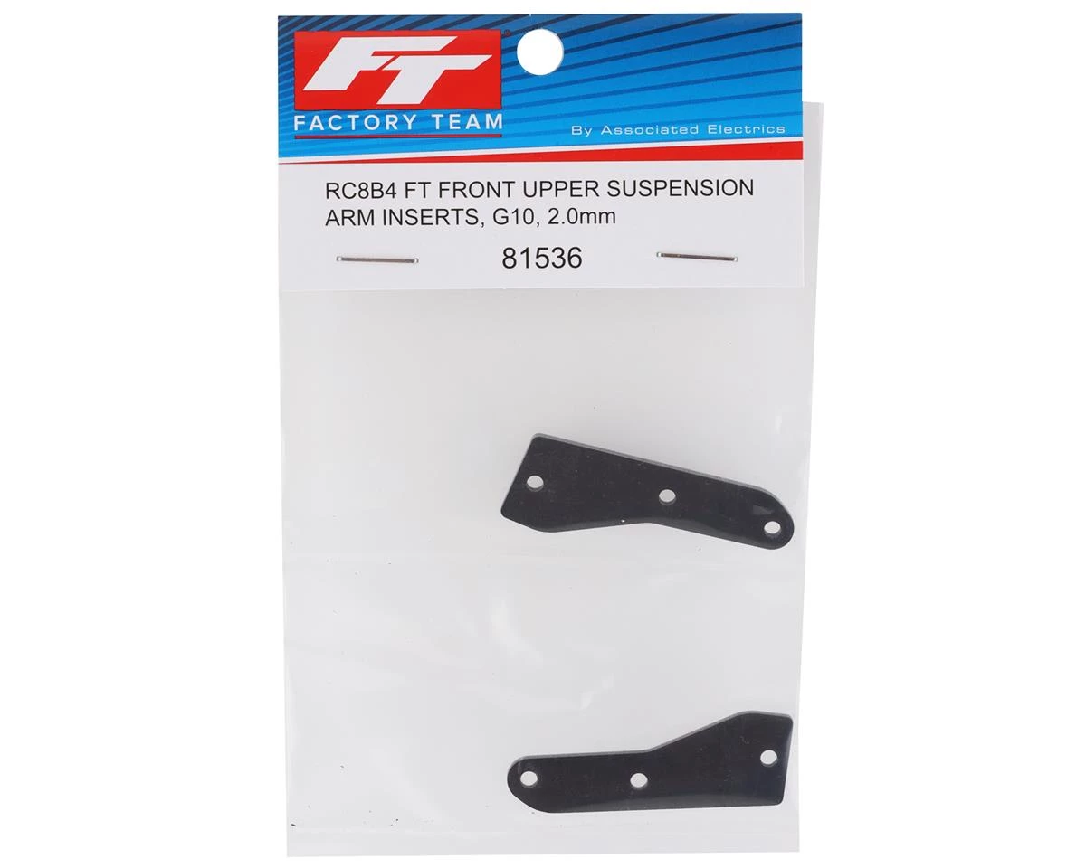 Team Associated RC8B4/RC8B4e Factory Team G10 Front Upper Arm Insert. These are an optional part intended to fit the RC8B4 and RC8B4e. When used these will provide added stiffness to the arms creating a more precise feel. Package includes two 2.0mm G10 Front Upper Suspension Arm Inserts.