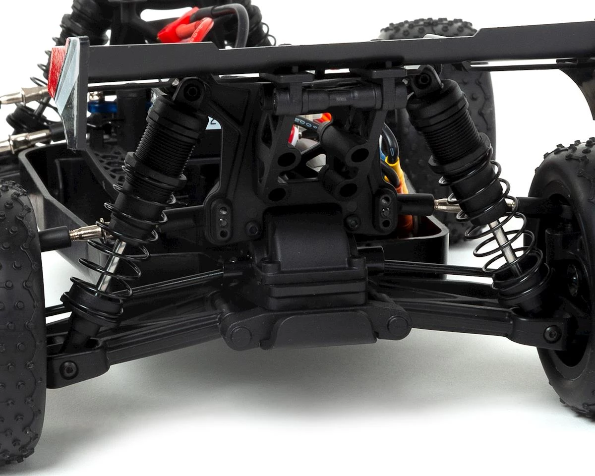 The Team Associated Reflex 14T RTR 4WD Truggy comes out of the box assembled, with a Reedy Power brushless ESC, motor, high-torque digital steering servo, and 2.4GHz radio system. With all that power and a 4WD drivetrain, the truggy’s design allows you to harness that power and turn it into pure fun! Adjustable turnbuckles, caster blocks, and rear hubs make the REFLEX 14T ready for any terrain you can throw at it. Additional features include three sealed differentials, aluminum steering rack, and lightweight aluminum center driveshaft. All you need to do is add batteries and you have big performance in a small-scale Ready-to-Run package!