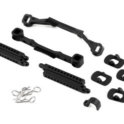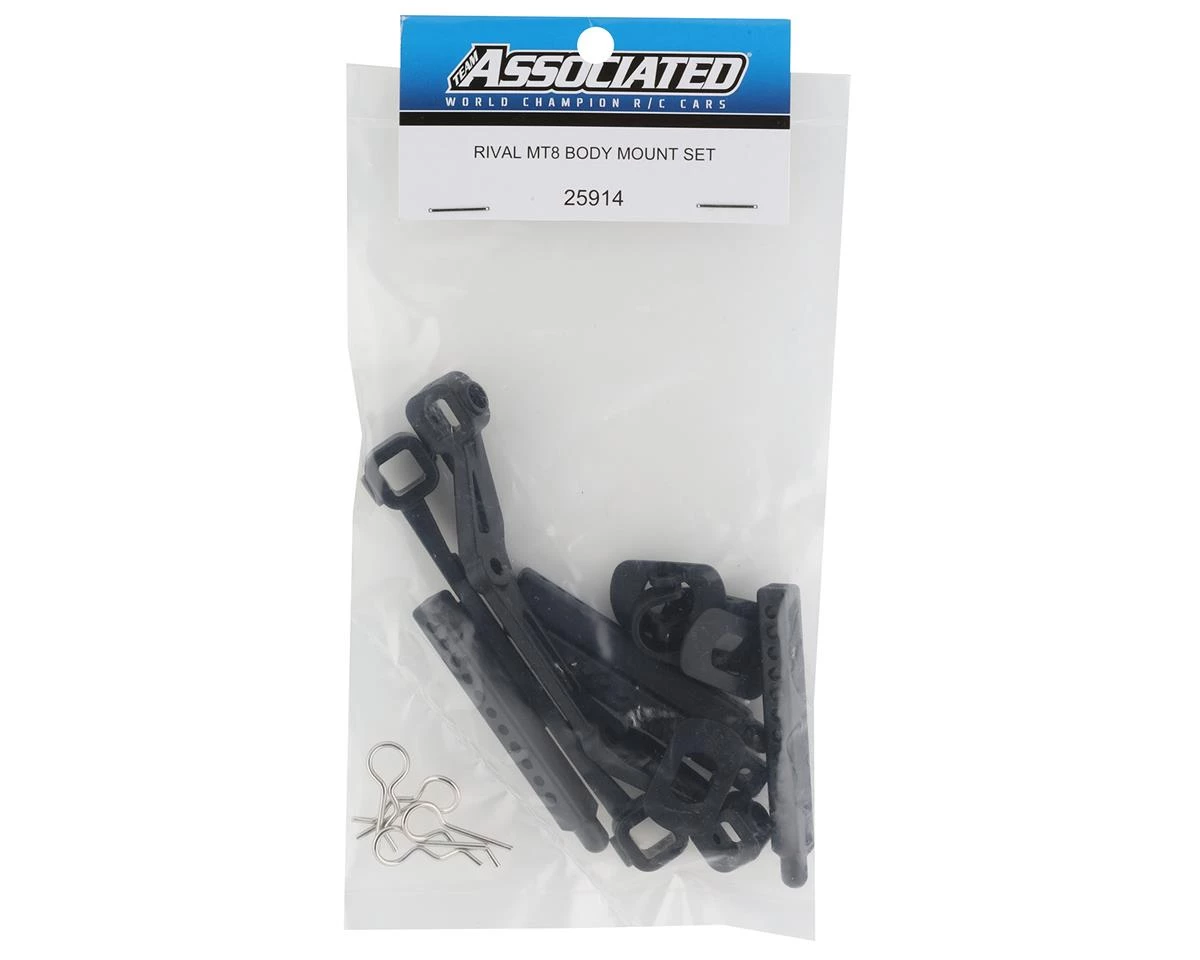 Team Associated RIVAL MT8 Body Mount Set. Package includes replacement plastic body mount components and body clips.