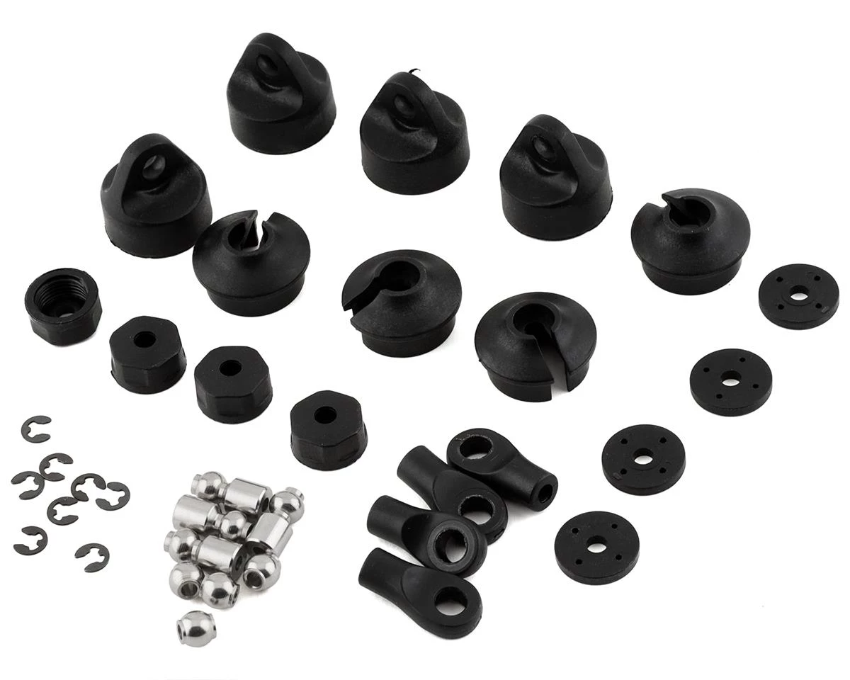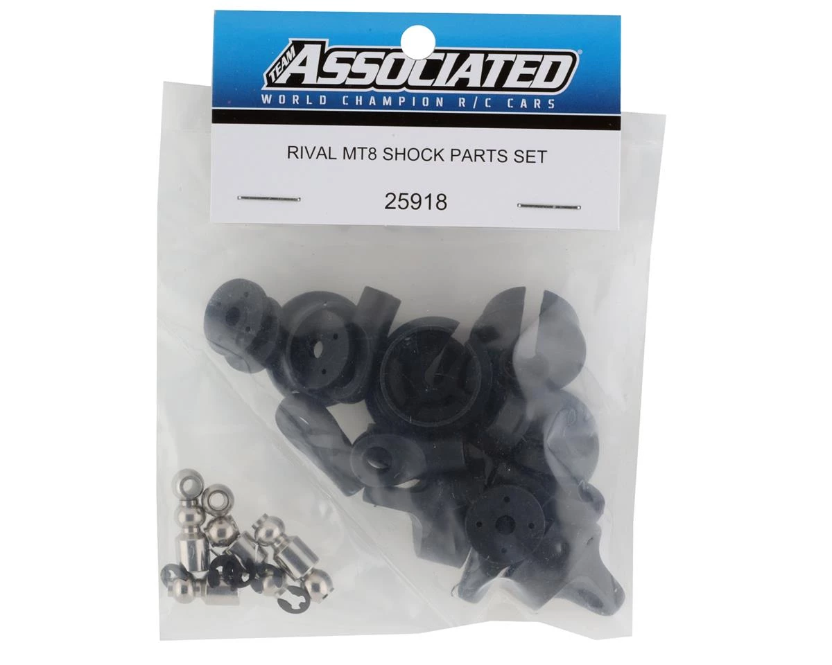 Team Associated RIVAL MT8 Shock Parts Set. Package includes replacement plastic shock components, pivot balls and e-clips.