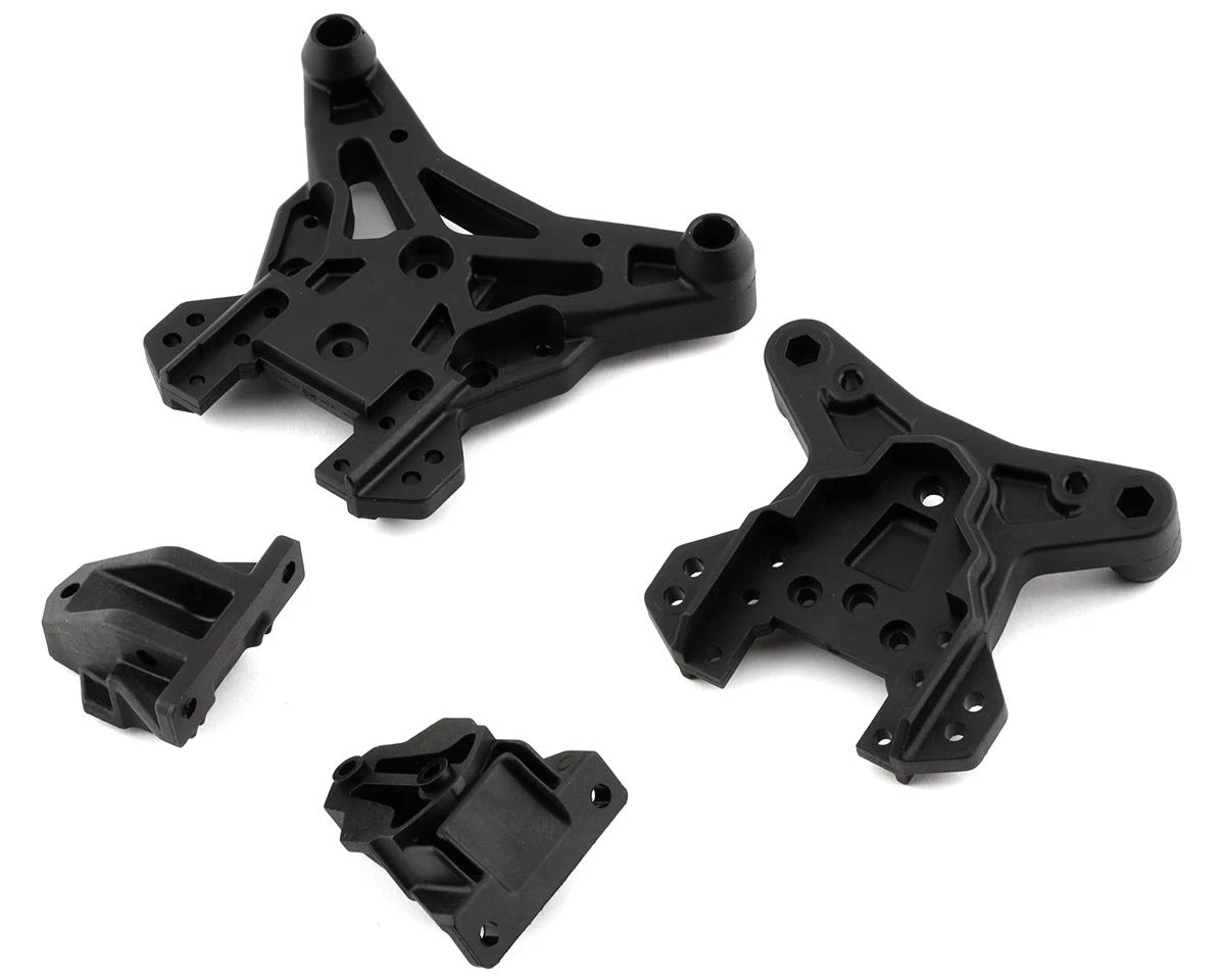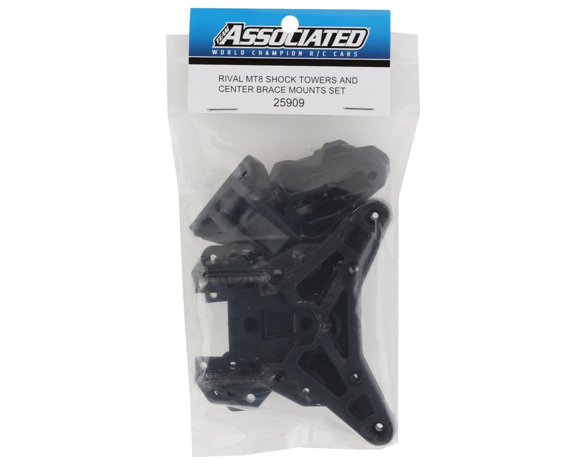 Team Associated RIVAL MT8 Shock Towers & Center Brace Mounts. Package includes replacement front and rear shock towers, and front and rear center brace mounts.