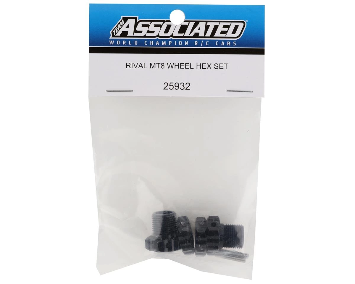 Team Associated RIVAL MT8 Wheel Hex Set. Package includes two replacement axle hexes, wheel nuts and cross pins.