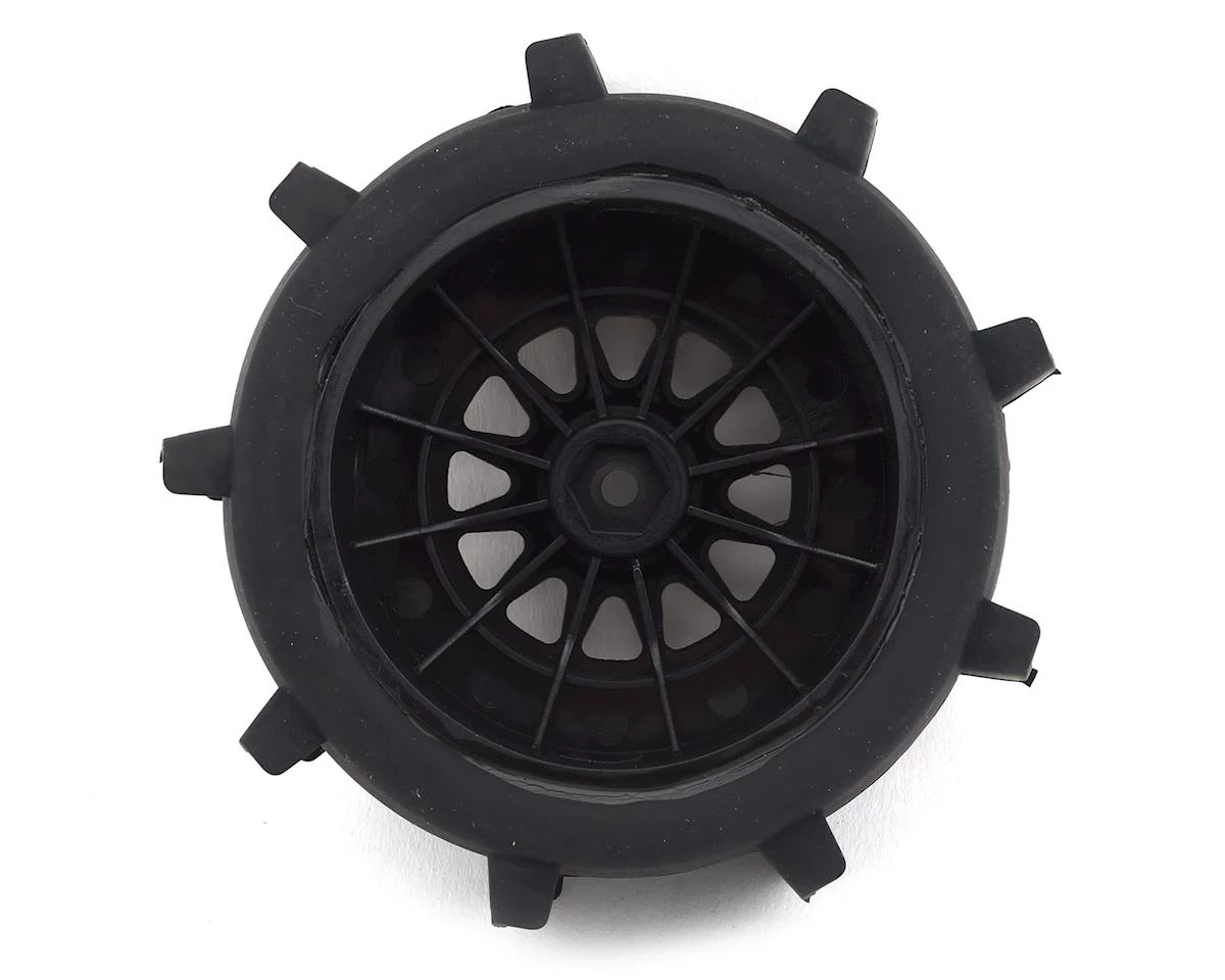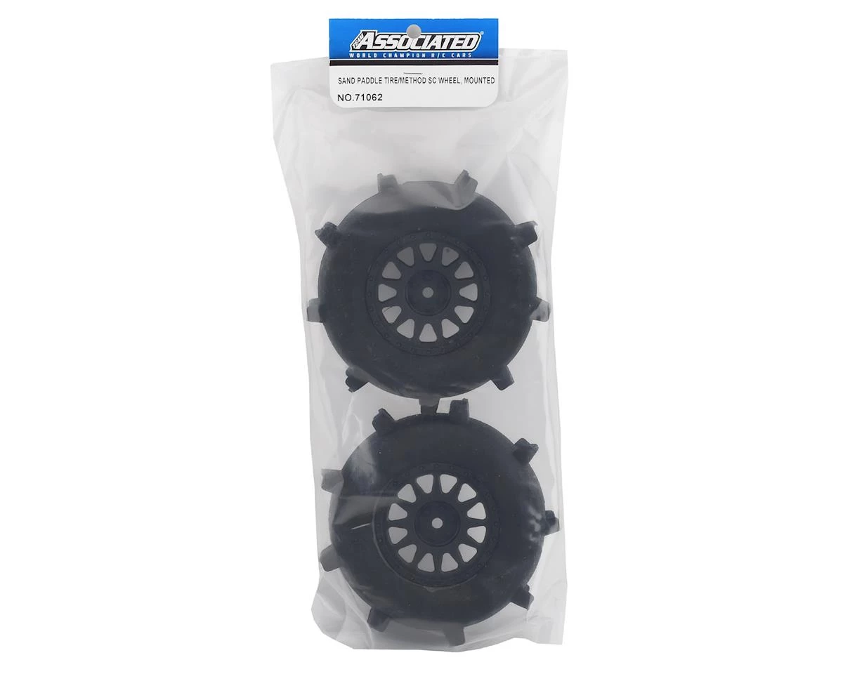 Team Associated Sand Paddle Pre-Mounted Rear Tires. These tires are made from a durable rubber compound that will perform well in the sand and snow, and have been premounted on Team Associated 12mm hex short course wheels, allowing compatibility with a variety of applications.