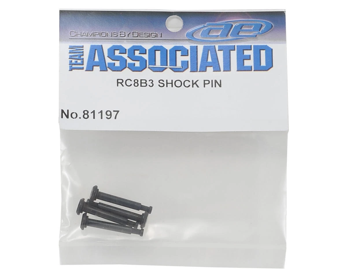 This is a pack of four replacement Team Associated RC8 B3 Shock Mount Pins. These pins are used to secure the lower shock mount to the suspension arm.