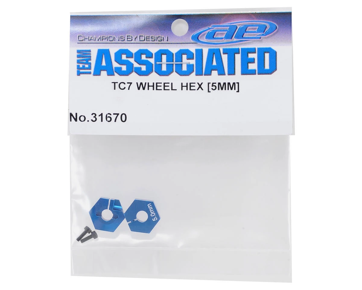 Team Associated TC7 5mm Wheel Hexes. These are the replacement 5mm aluminum clamping style hexes. Package includes two hexes and two cap head screws.