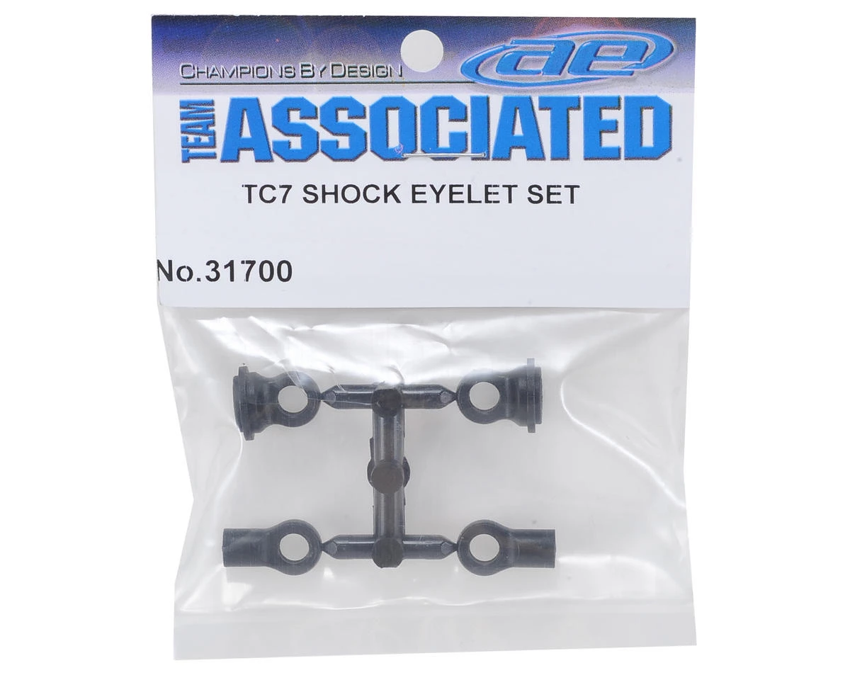 Team Associated TC7 Shock Eyelet Set. This is the replacement eyelet set for the TC7 touring car. Package includes two upper eyelets and two lower eyelets.